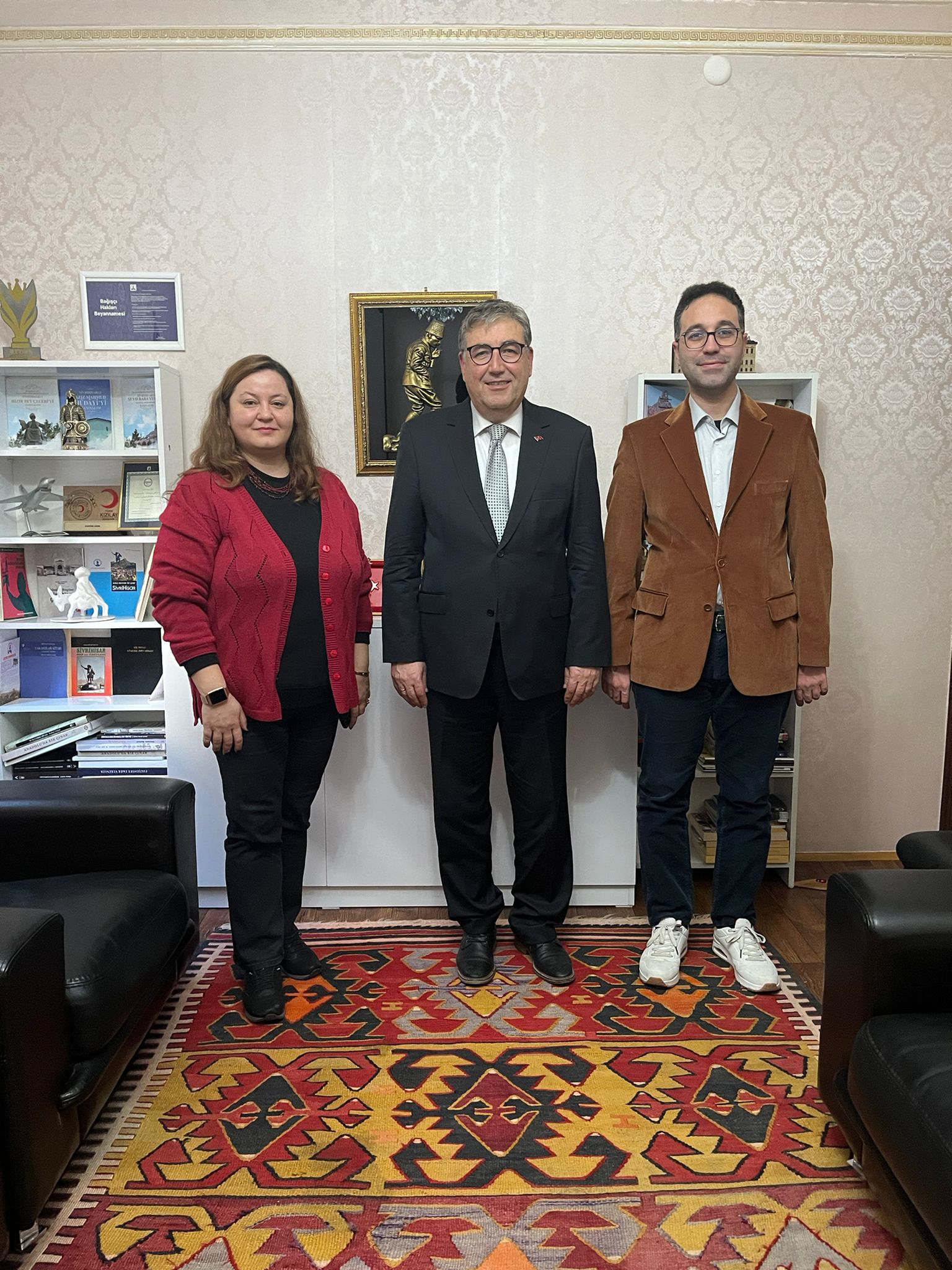 Sivrihisar Vocational School Director Assoc. Prof. Dr. Ramazan Kürşat ÇEÇEN and Deputy Director Instructor Dr. Esra SERTEL visited Bekir KALIR, Chairman of the Sivrihisar Education Foundation (SEV) Board of Directors and a member of our Vocational School's Advisory Board, at the foundation's new headquarters.